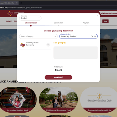 Click on the "Give" button located in the right corner of the page (Give to MSU).