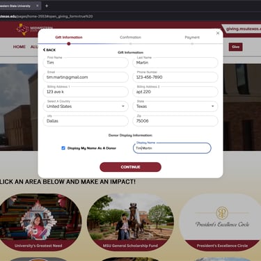 Enter your full name in the "Donor Display Information" section, or uncheck the box if you prefer not to have your name displayed, and press "Continue."